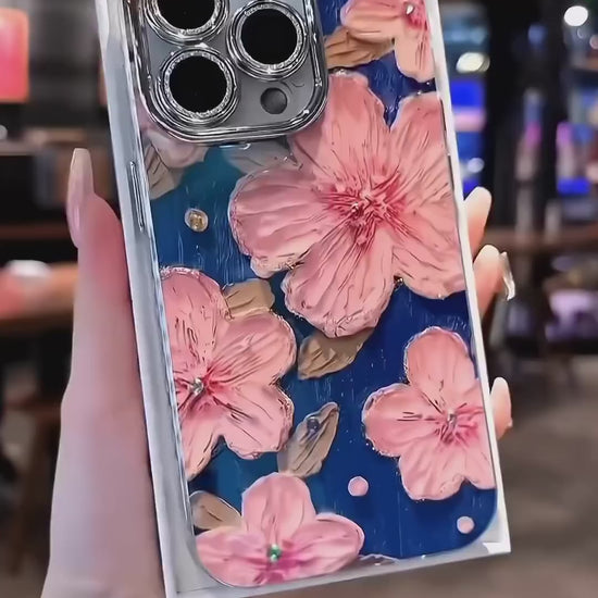 La Flower Case resalta por su diseño artístico y lleno de vida. Con un fondo azul profundo y flores en tonos rosados y dorados, esta funda transforma tu iPhone en un accesorio elegante y femenino.