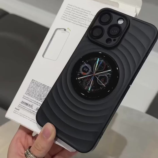 La Revolvex Case combina innovación y estilo en un diseño único. Su característica principal es el soporte trasero giratorio con forma de cronómetro, que permite apoyar el iPhone en posición horizontal o vertical para ver videos, videollamadas o trabajar cómodamente.