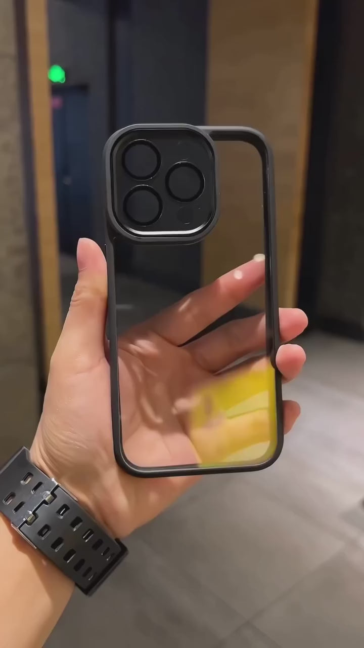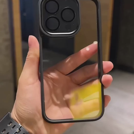 La Slim Clear Cover destaca por su diseño transparente y ultradelgado que realza el color original del iPhone sin añadir volumen. Su marco en tono negro crea un contraste elegante que resalta la cámara y los bordes, brindando un aspecto limpio y moderno.